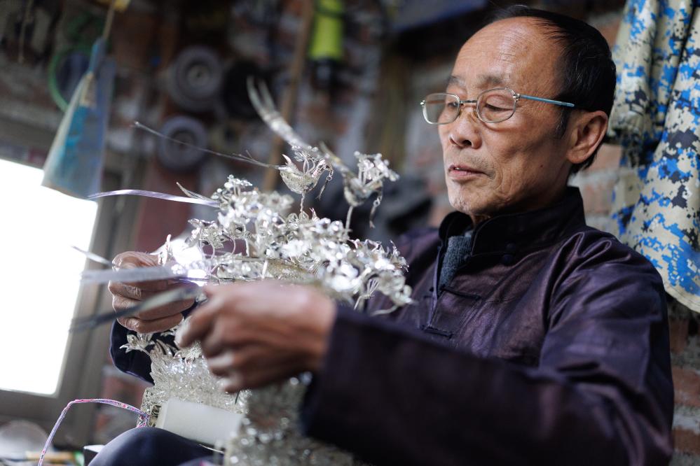 黎平县水口镇纪流村的银匠石传顺在家中制作银饰(4月21日摄)。
