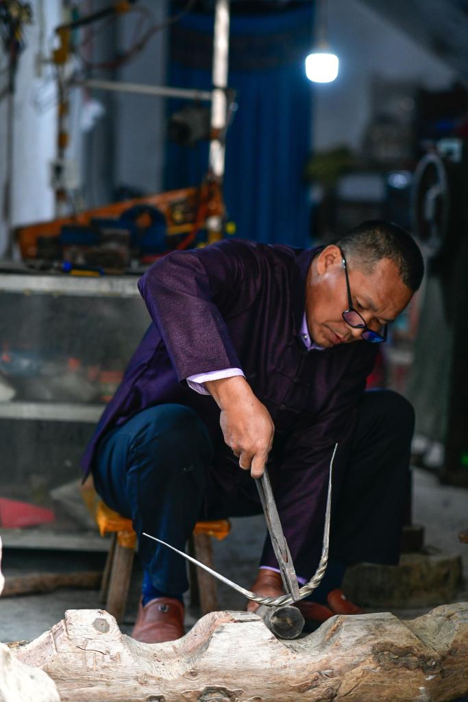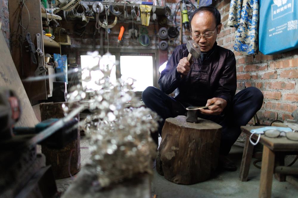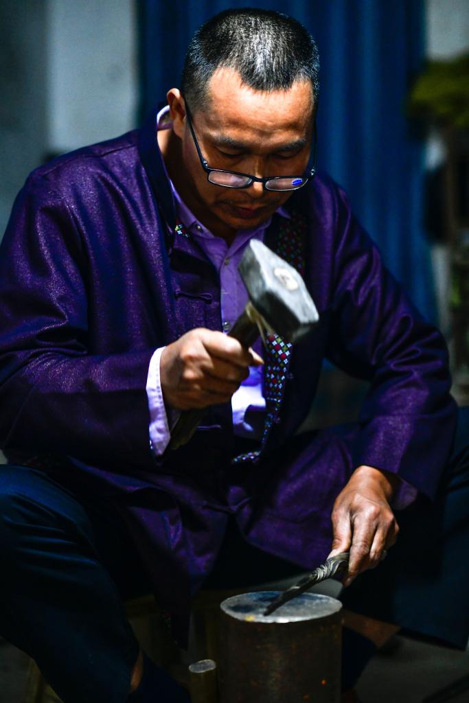 4月21日,贵州省黎平县水口镇的侗族银匠杨光儒在锻造银项圈。