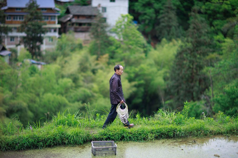 黎平县水口镇纪流村的银匠石传顺在给村民送银饰的途中(4月21日摄)。