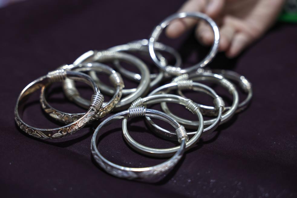 4月21日,贵州省黎平县水口镇的侗族姑娘杨爱鲜在展示父亲锻制的银手镯。