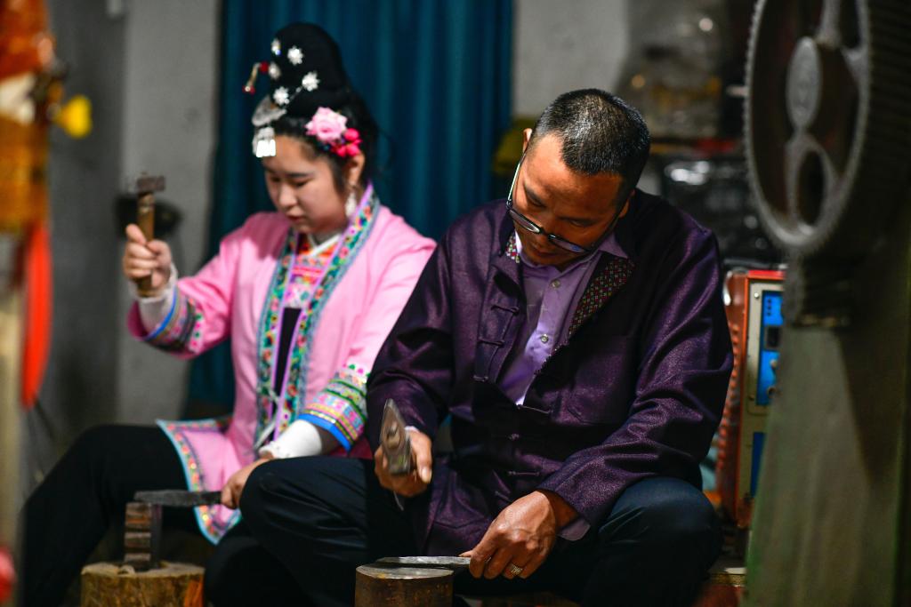 4月21日,贵州省黎平县水口镇的侗族银匠杨光儒(右)与女儿杨爱鲜一起锻造银项圈。