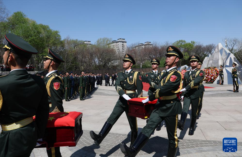 4月23日,在沈阳抗美援朝烈士陵园,礼兵护送志愿军烈士棺椁缓步进入纪念广场。新华社记者 李钢 摄