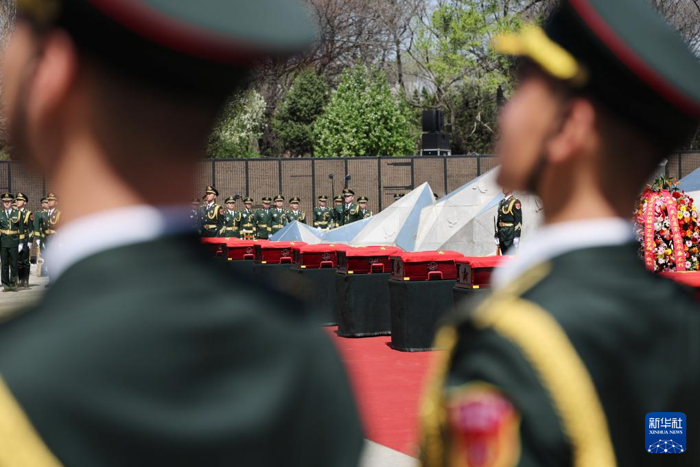 4月23日,在沈阳抗美援朝烈士陵园,志愿军烈士棺椁摆放在纪念广场。新华社记者 李钢 摄