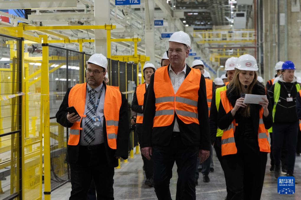 4月21日,在匈牙利南部城市塞格德,市长博特卡·拉斯洛(中)参观比亚迪乘用车生产基地总装车间。新华社发(弗尔季·奥蒂洛摄)