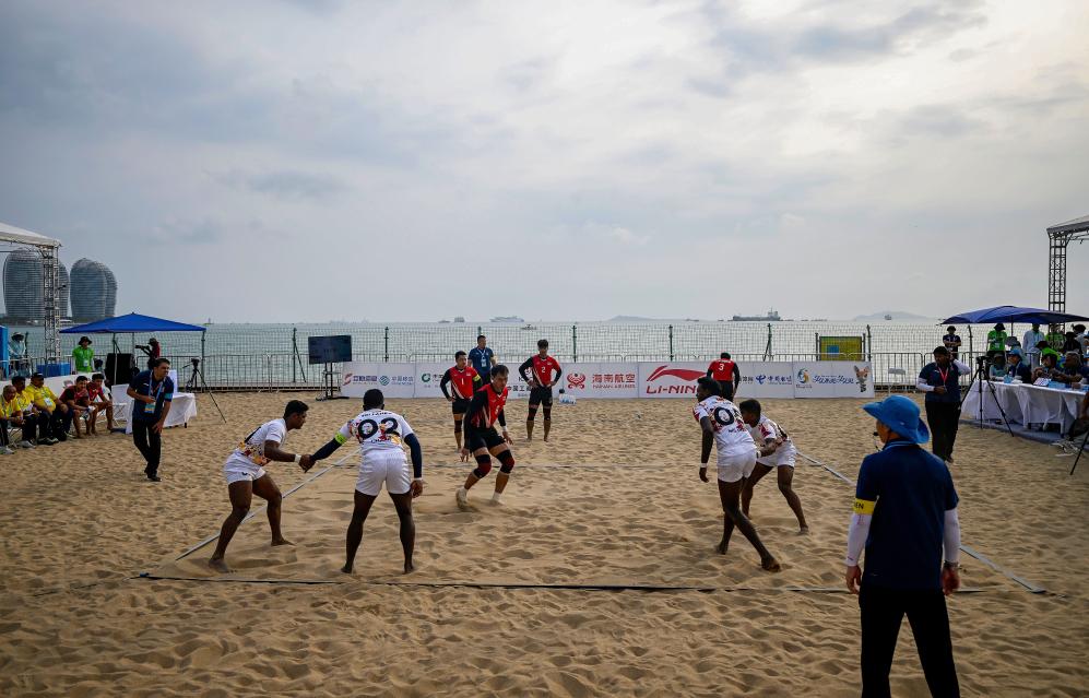 4月23日,斯里兰卡队和泰国队在沙滩卡巴迪男子小组赛中。新华社记者 赵子硕 摄
