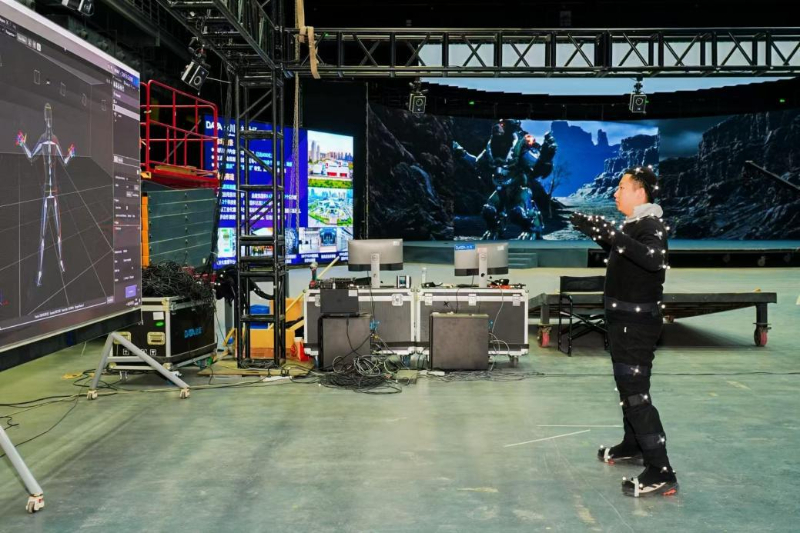 2026年4月23日,在重庆永川科技片场,工作人员示范动作捕捉。新华网发(夏国燕 摄)