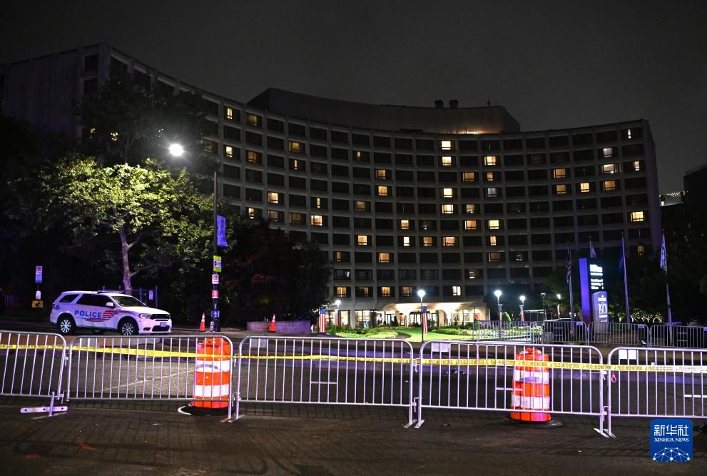 4月25日,举行白宫记者协会晚宴的美国华盛顿希尔顿酒店前拉起路障。新华社记者 李睿 摄