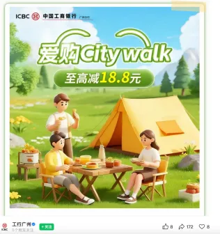 工商银行广州分行推出“爱购city walk”活动,并表示活动期间,广州地区工行信用卡客户在天人山水大地艺术园指定渠道消费,使用微信支付绑定广州地区工行信用卡完成付款,有机会享受满20元随机立减2.8-8.8元,满100元随机立减10.8-18.8元优惠,单笔消费至高减18.8元。