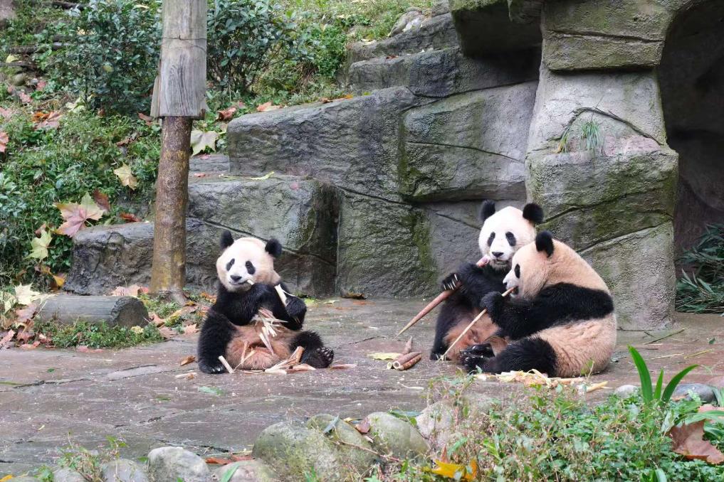 在中国大熊猫保护研究中心雅安基地的熊猫幼儿园里,饲养员肖永莉正忙碌着为双胞胎大熊猫“佳雨”“佳雪”和它们的妈妈“汪佳”备餐。她熟练地劈开竹竿,摆放好竹笋,一切准备就绪后,闸门打开,圆滚滚的大熊猫跑了出来。