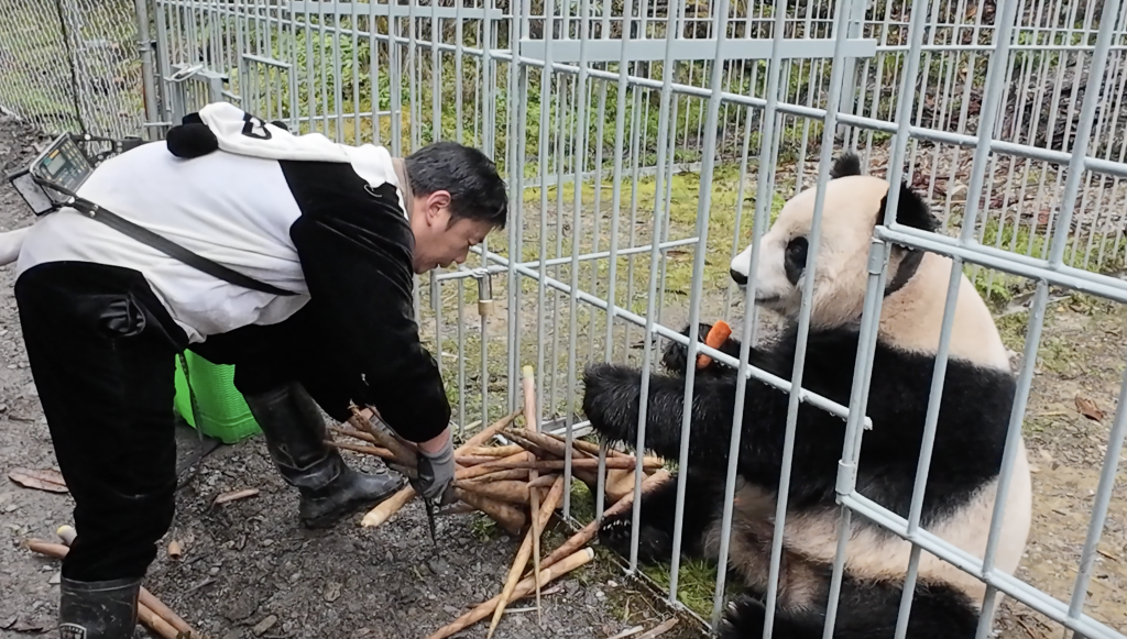 “这一点是最难的。”刘晓强说,“我们要穿上熊猫服,在投喂妈妈的时候和幼仔斗智斗勇,想办法把它引开。”就在“灰灰”进食的时候,刘晓强频频抬头四顾,检查幼仔的行踪,“这只幼仔性格胆小一些,我们晃动树枝制造出一些声音,它听到后就不敢过来了。”