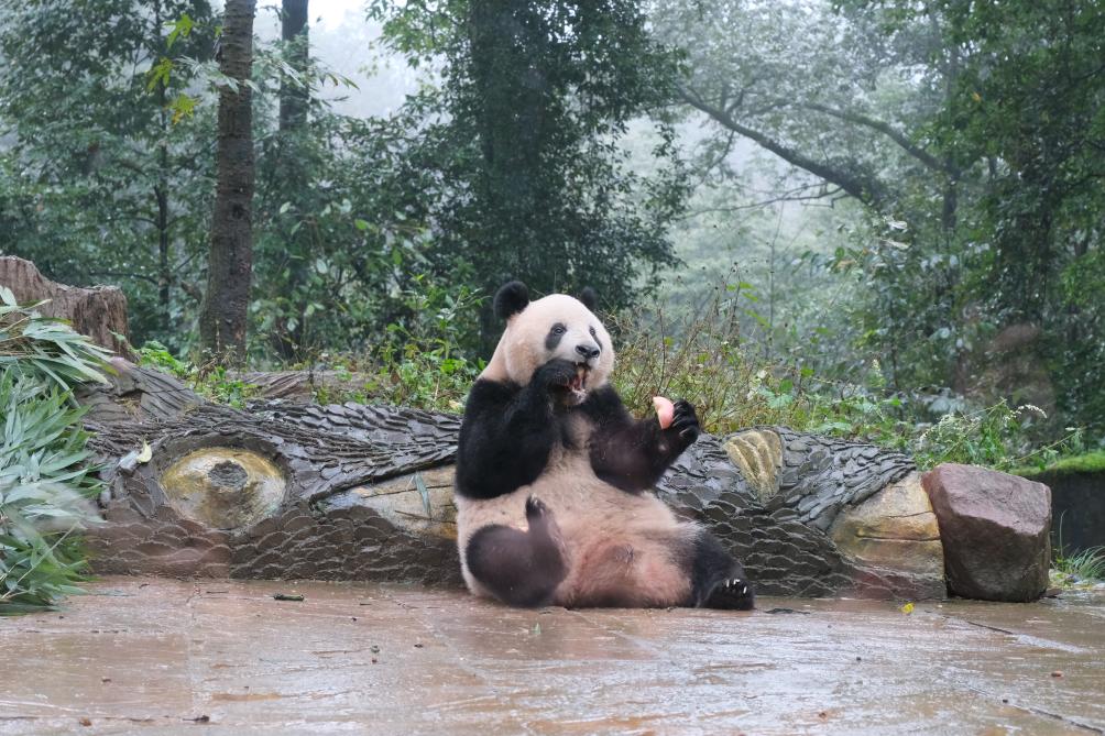 11月5日,大熊猫“香香”正在吃苹果。新华社记者 边思琪 摄