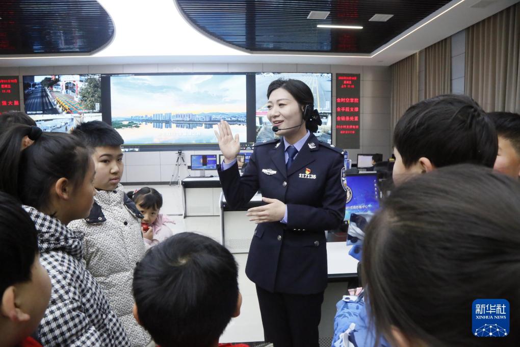 2025年1月10日,河南省洛阳市汝阳县公安局举行警营开放日活动,当地警察子女在110接处警大厅参观。新华社发(康红军 摄)