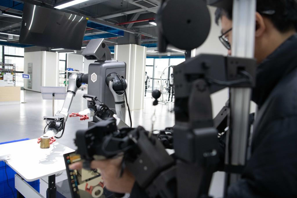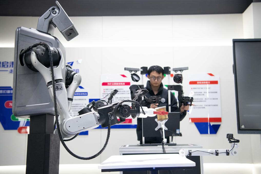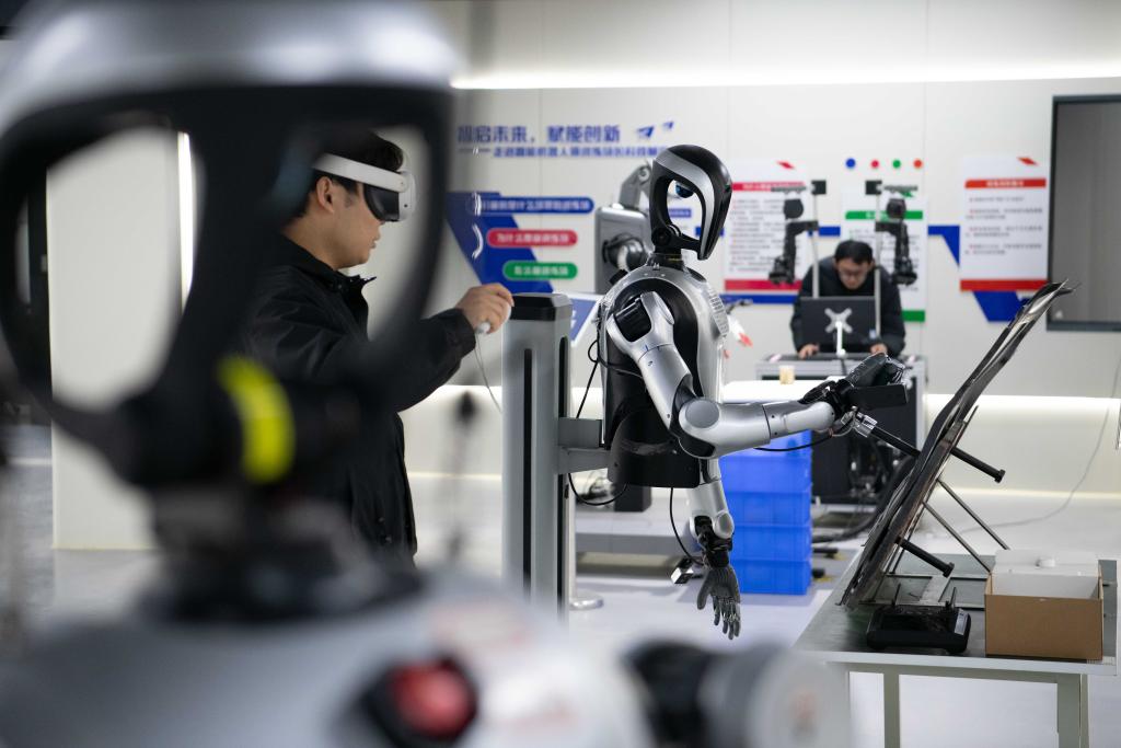 12月4日,在合肥市具身智能机器人数据采集预训练场,一台人形机器人正在进行零件拣选的相关训练。新华社记者 张端 摄