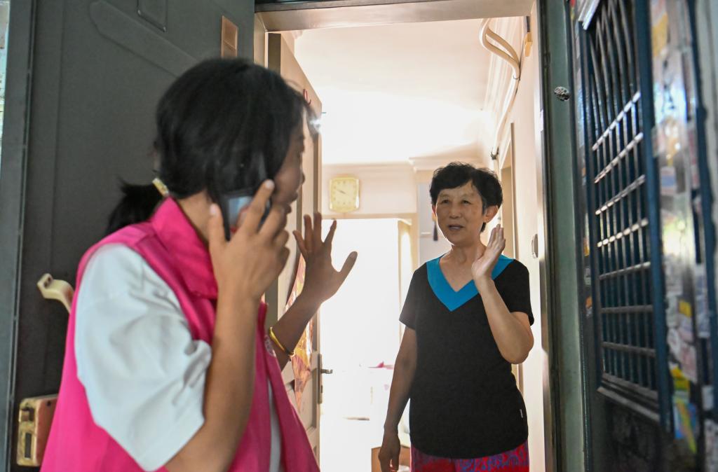 在天津市河西区西园西里社区,“养老管家”上门回访后与老人告别(5月29日摄)。新华社记者 孙凡越 摄