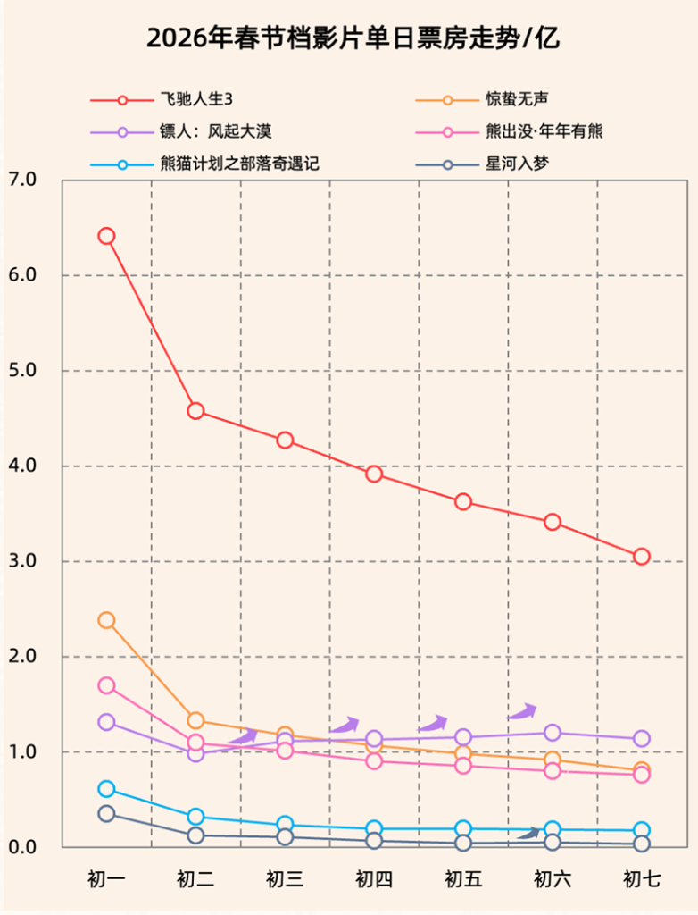 国家电影局2月24日发布数据,2026年春节档电影票房为57.52亿元,观影人次为1.20亿。数据显示,今年春节档总场次超435万,刷新中国影史春节档总场次纪录。与此同时,档期内平均票价降至47.8元,为近六年最低水平,降低了大众观影门槛。票房方面,《飞驰人生3》领跑,《惊蛰无声》《镖人:风起大漠》《熊出没·年年有熊》《熊猫计划之部落奇遇记》《星河入梦》位列二至六位。