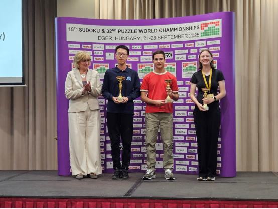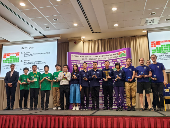 当地时间9月24日晚,第十八届世界数独锦标赛在匈牙利埃格尔举行颁奖仪式,中国代表队蝉联团体冠军,日本队和捷克队分别获得了亚军和季军。在个人比赛中,中国代表队队员戴潭潭获得了个人赛冠军,胡宇轩获得个人赛季军,日本选手森西亨太获得亚军。中国B队选手邱苏喆获得了U18岁组冠军。