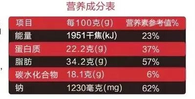 例如,上面这个零食,我们可以看到其钠的 NRV%为 62%。该数值代表吃单位量(此处为 100g)的该零食,摄入的盐就已经占据一天推荐量的一半以上。这意味着,按照新版膳食指南中普通成年人每日推荐盐摄入量为 5g 计算,吃了这份零食,一天中三餐和其他食物中的盐,最好控制在 1.9g 以内。