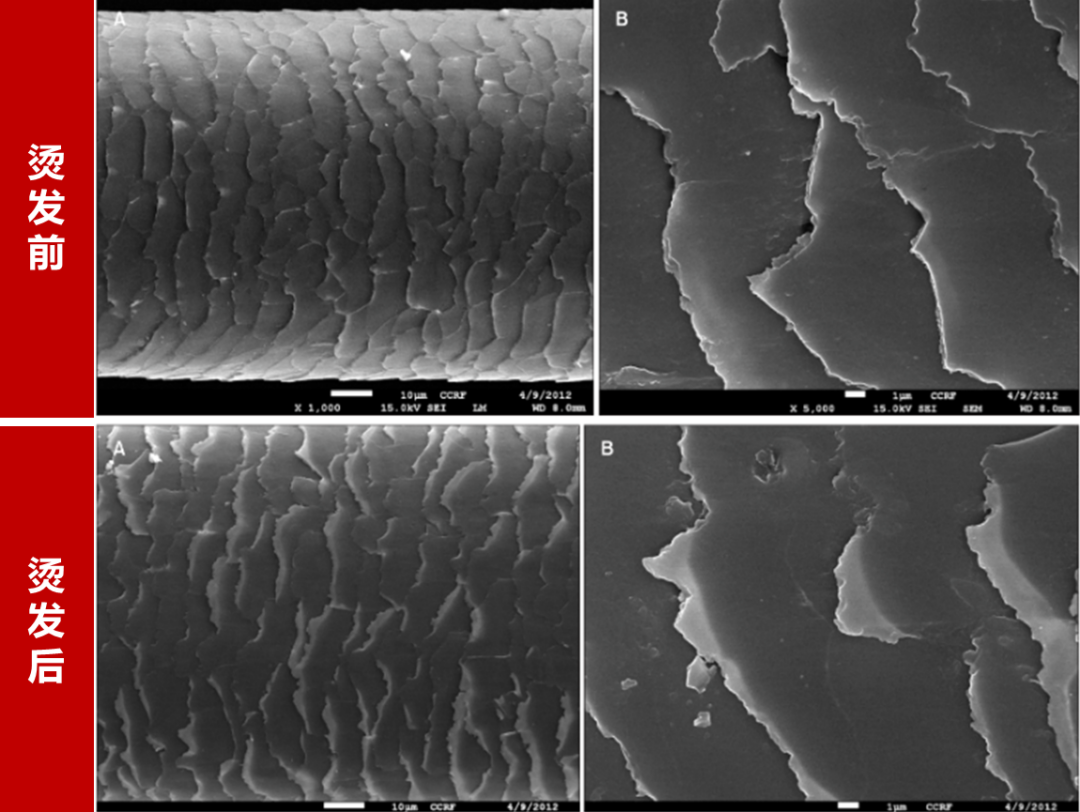 下面的这张图,就展示了烫发前后的头发表皮层的改变。