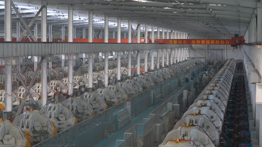 “克拉自由”源自科技进步。相比于形成天然钻石需要的漫长且苛刻的自然条件,在力量钻石的生产车间,放在一台六面顶压机里的石墨柱合成块历经7到15天的高温高压后,即可“孕育”出高纯度钻石原石。