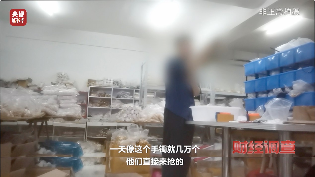记者来到一家名为煜乾商贸有限公司,专门为直播间电商提供仿金饰品。在公司库房里,仿金饰品堆在货架上,吊坠、手链、手镯、戒指、项链、耳钉,品类繁多、应有尽有,满屋金灿灿让人眼花缭乱。