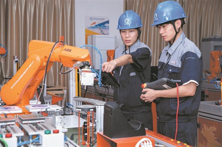 黎明职业大学学生在进行工业机器人操作与运维实训