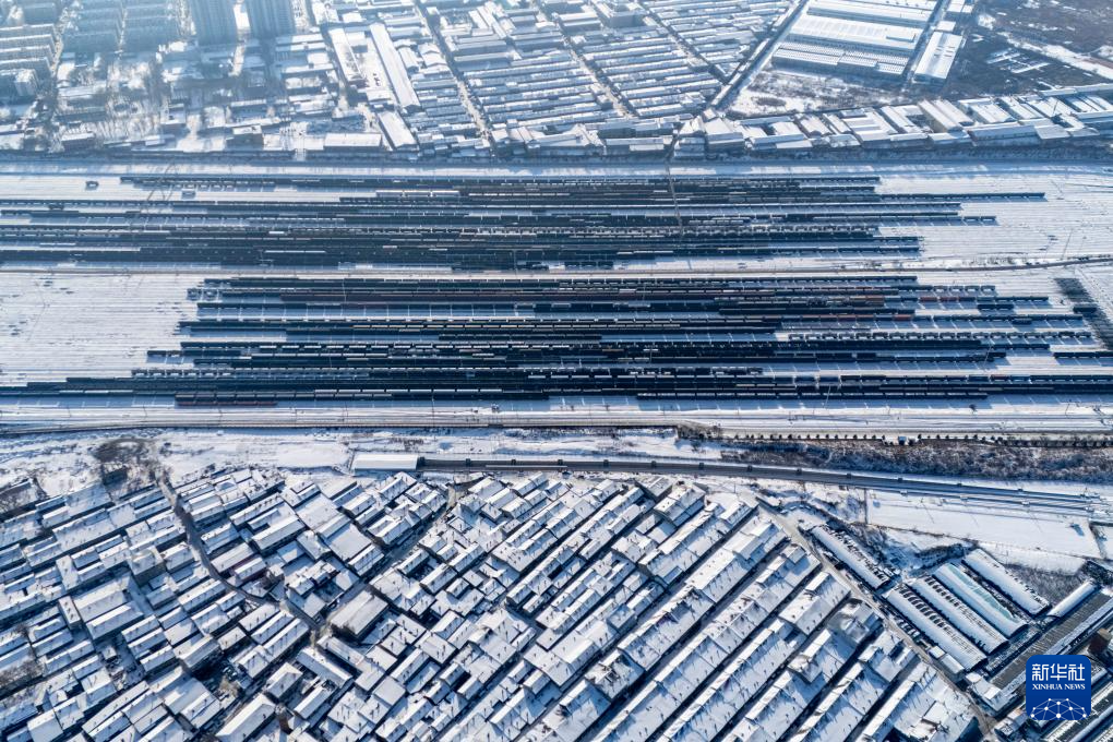 1月15日,装满物资的货运列车在黑龙江省哈尔滨南站编组站场整装待发(无人机照片)。