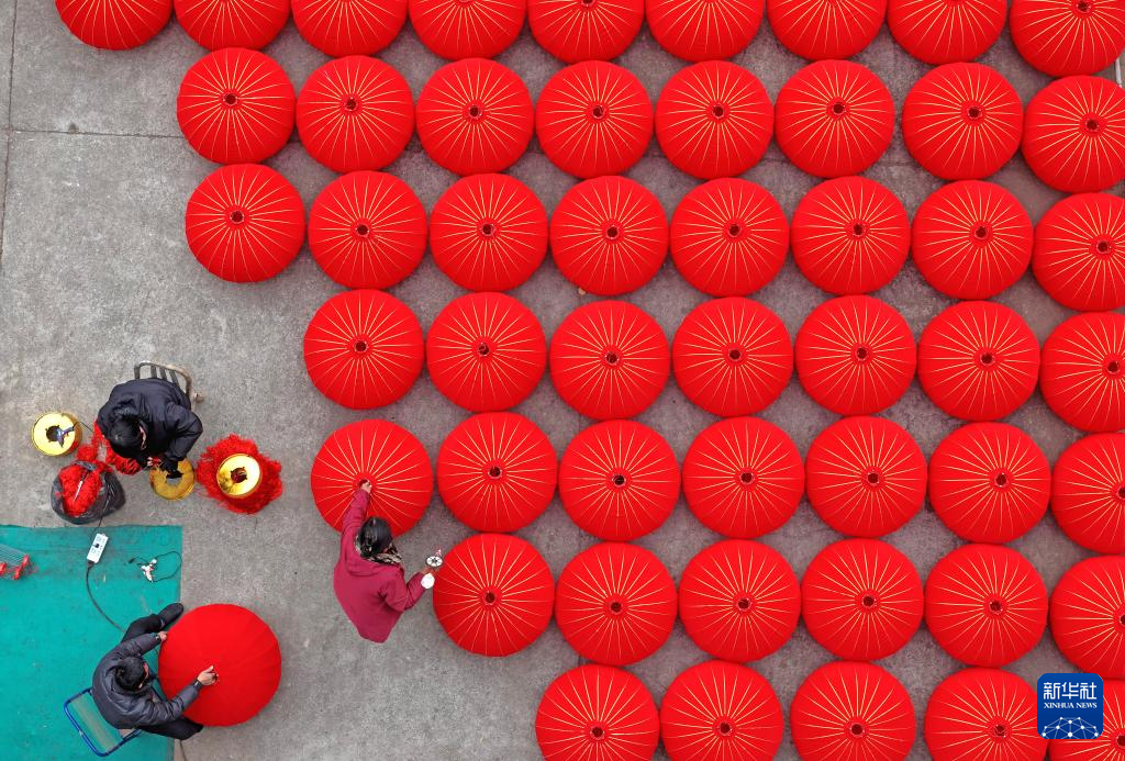 1月21日,在浙江省台州市仙居县横溪镇一家灯笼加工作坊,工人赶制大红灯笼(无人机照片)。