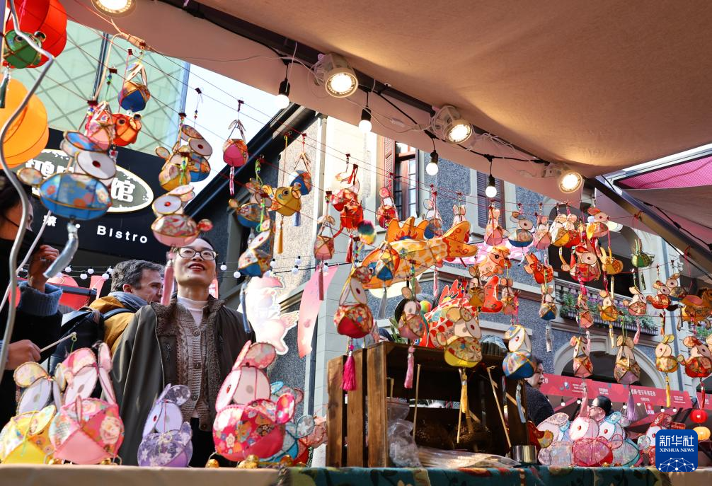 1月23日,上海思南年宵花市上的传统彩灯手工艺品吸引游客驻足观看。
