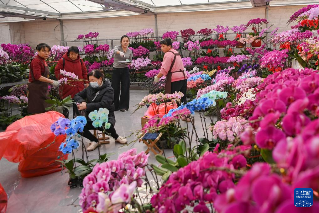 1月22日,河北省遵化市遵化镇张家坎村农民在暖棚管护花卉,准备供应节日市场。