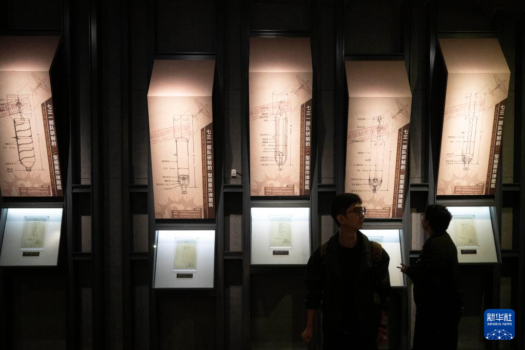 9月18日,参观者在侵华日军第七三一部队罪证陈列馆参观七三一部队研制的细菌炸弹图纸。