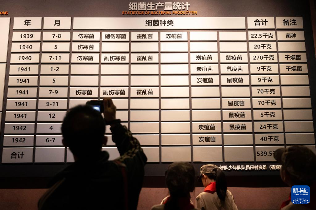 9月18日,参观者在侵华日军第七三一部队罪证陈列馆拍摄细菌生产量统计展板。