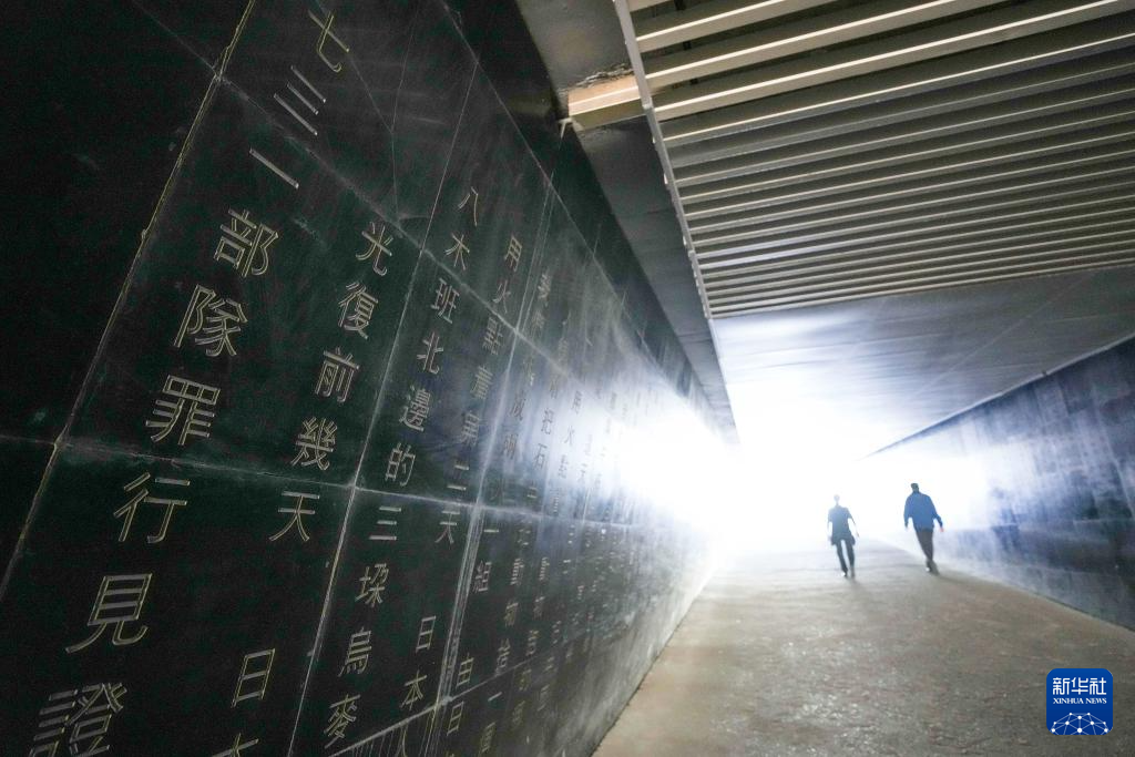 9月18日,参观者从侵华日军第七三一部队罪证陈列馆的“证言墙”前走过。
