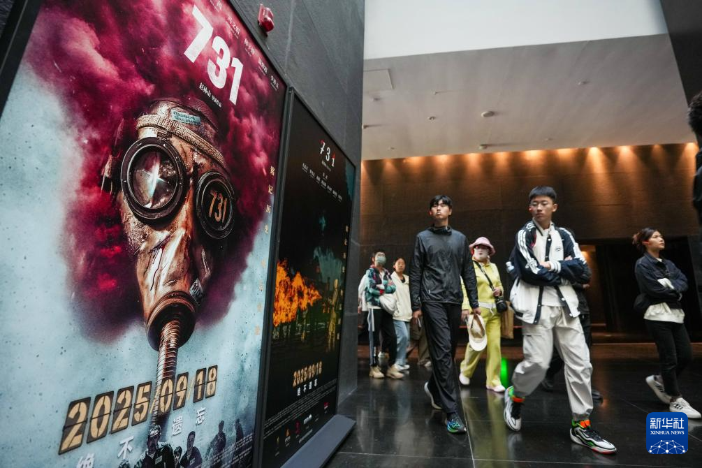9月18日,在侵华日军第七三一部队罪证陈列馆,参观者从电影《731》海报旁经过。