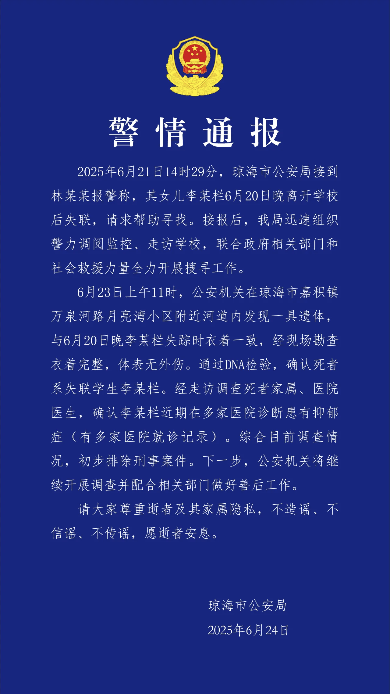 6月23日上午11时,公安机关在琼海市嘉积镇万泉河路月亮湾小区附近河道内发现一具遗体,与6月20日晚李某栏失踪时衣着一致,经现场勘查衣着完整,体表无外伤。通过DNA检验,确认死者系失联学生李某栏。经走访调查死者家属、医院医生,确认李某栏近期在多家医院诊断患有抑郁症(有多家医院就诊记录)。综合目前调查情况,初步排除刑事案件。下一步,公安机关将继续开展调查并配合相关部门做好善后工作。