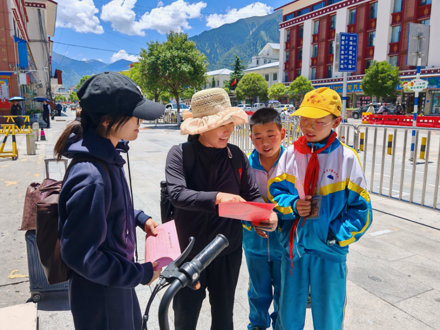 实践团在林芝市第二小学门口发放“推普”宣传册。