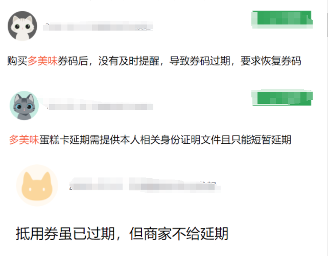 北京消费者李佳(化名)向记者投诉说:“我在家里找到1张过期的多美味300元蛋糕券和8张仅限在巴黎贝甜使用的优惠券。拨打客服热线询问如何延期,客服查询后告知,蛋糕券还有余额,但是已过期2年,已经作废不能延期,优惠券也同样是过期作废。”李佳与客服交涉后客服表示可以激活蛋糕券,但需充值或扣除余额的20%,8张优惠券已作废,愿给5张新券,李佳未同意。