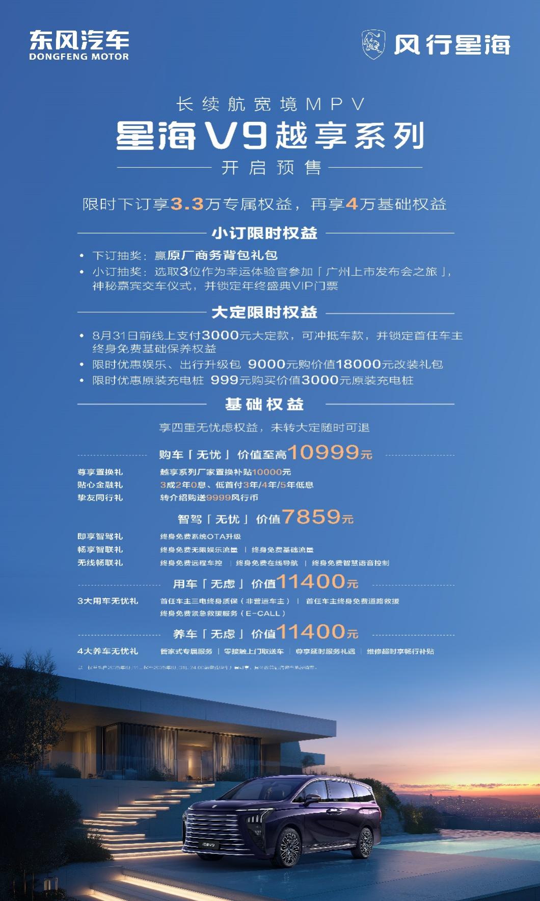 2025年8月11日,东风汽车旗下东风风行星海V9越享系列正式开启预售,预售价格19.99万元,成为行业首款20万内中大型插混MPV。