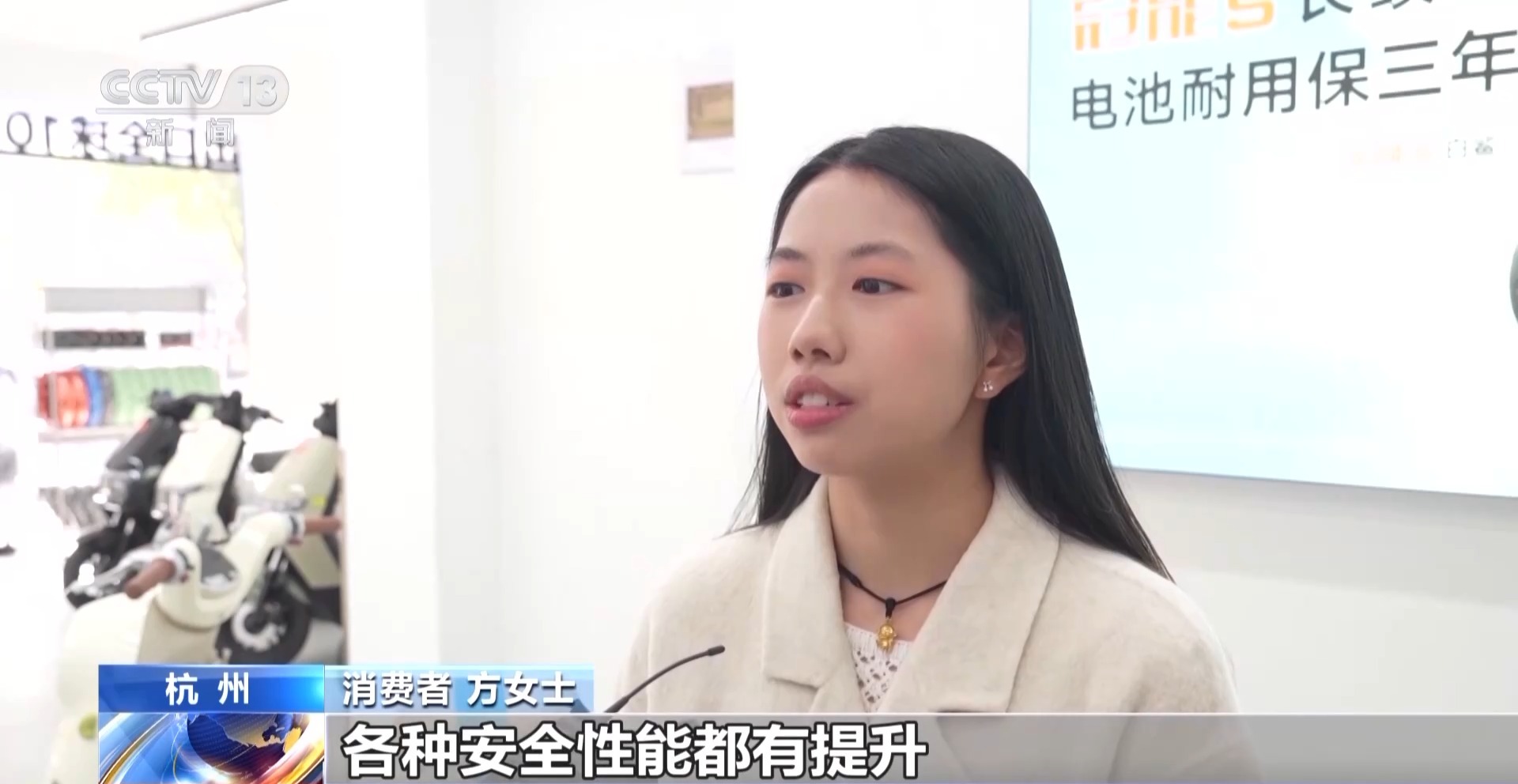 消费者方女士:新国标相对于旧国标,各种安全性能都有提升,上路也会相对更加安全,我也会更加放心。