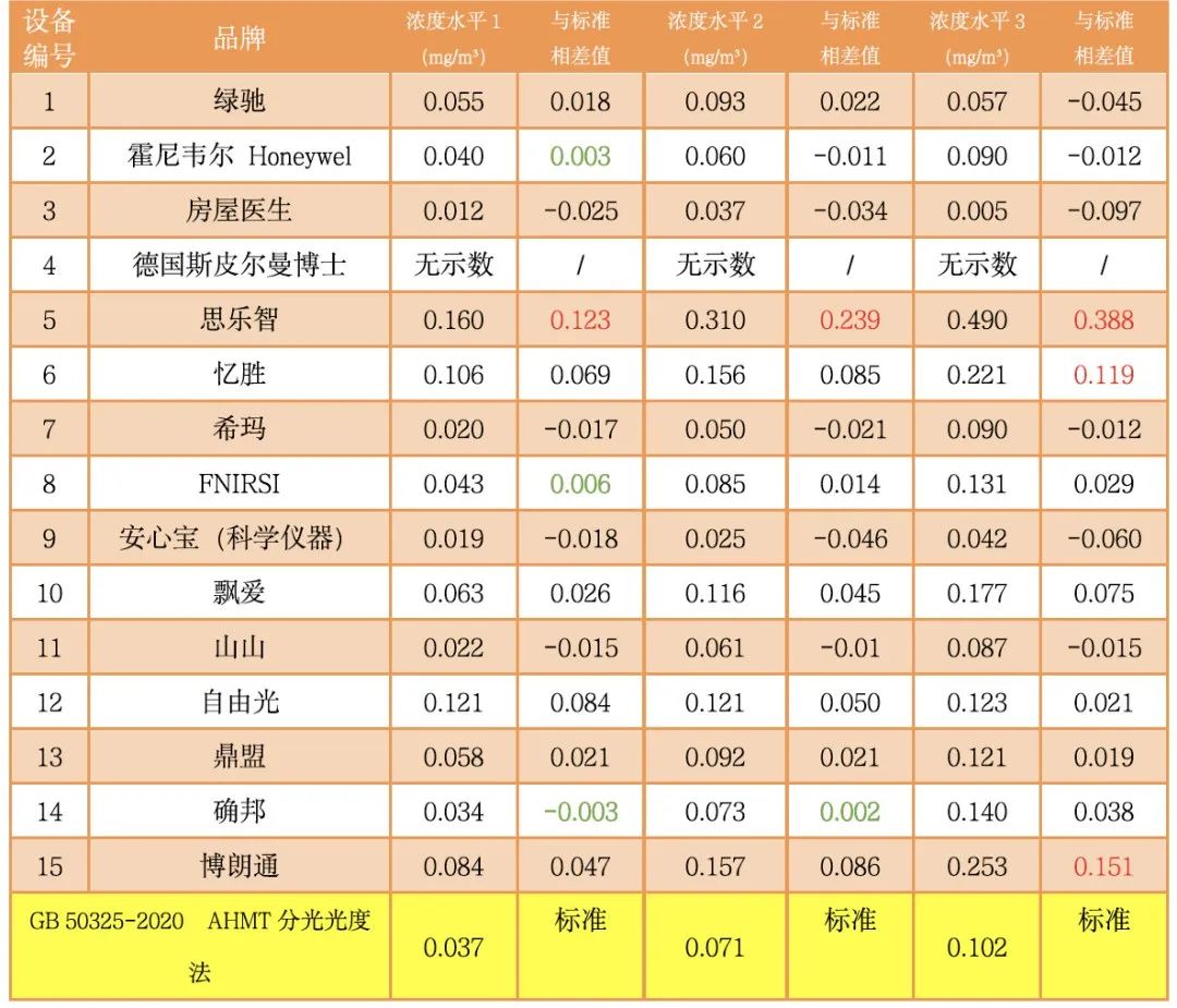 上海市消保委先用购买的15款仪器在统一环境下进行了甲醛数据检测,随后再用现行的测量空气甲醛的国家强制标准方法检测一遍,将两者进行数据对比。