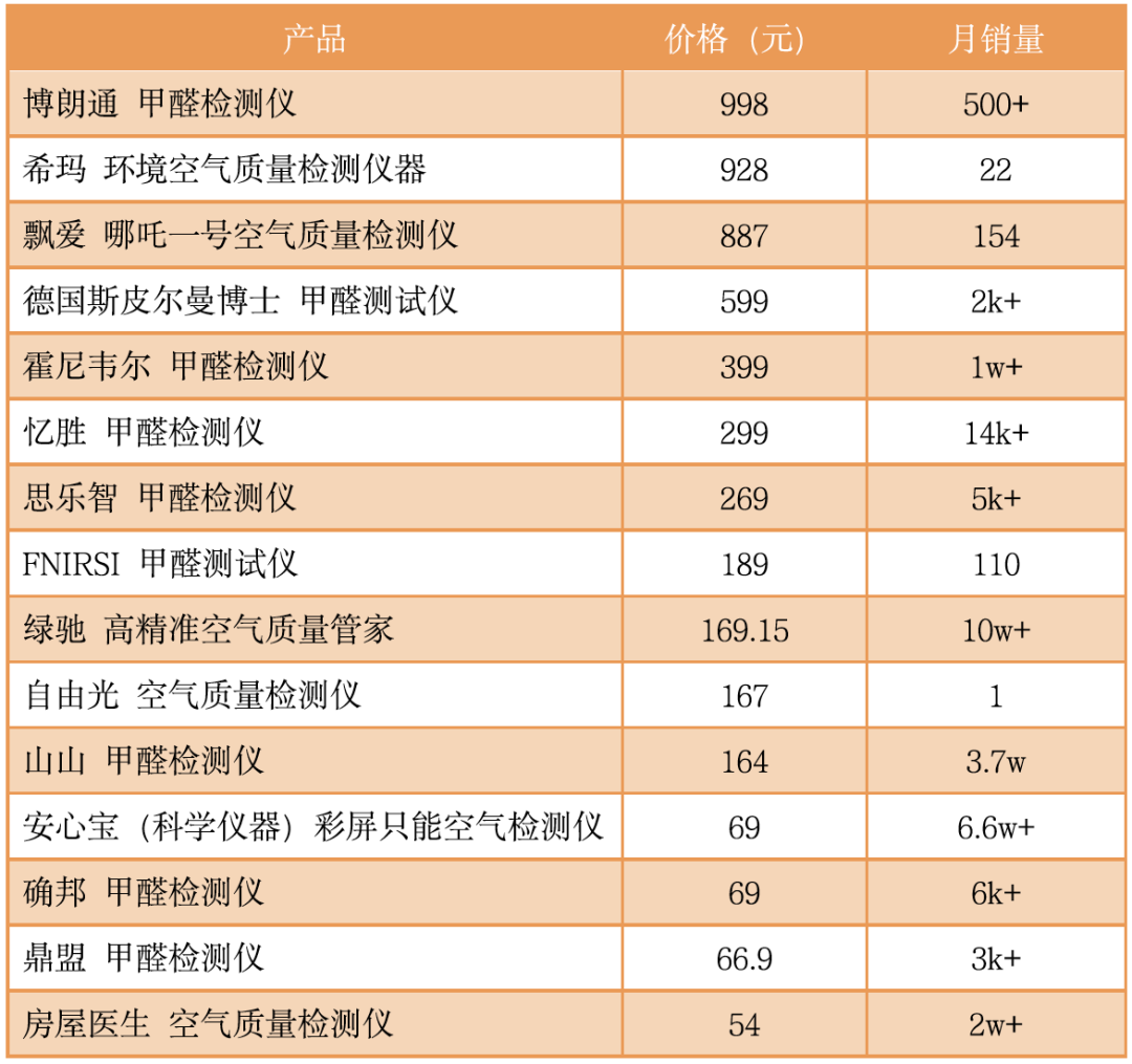 15款甲醛测试仪,价格区间从几十到近千元,月销量最高达10万+,涉及思乐智、忆胜、博朗通等品牌。