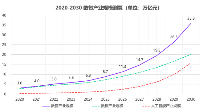据《报告》测算,2024年我国数智产业规模为6.78万亿元,2020-2024年间年均增长率为26%;预计2024-2030年,我国数智产业规模将维持28%的年均增长率。据此推算,2025年我国数智产业规模将达到8.71万亿元,2026年突破10万亿元,2030年达到35.8万亿元。