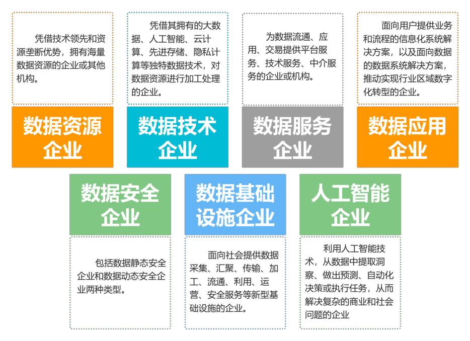 具体而言,数智产业由数据资源、数智技术、数智产品、数智企业、数智生态等五大要素构成。其中数智企业是重要主体,又可划分为数据资源企业、数据技术企业、数据服务企业、数据应用企业、数据安全企业、数据基础设施企业、人工智能企业七大类型。