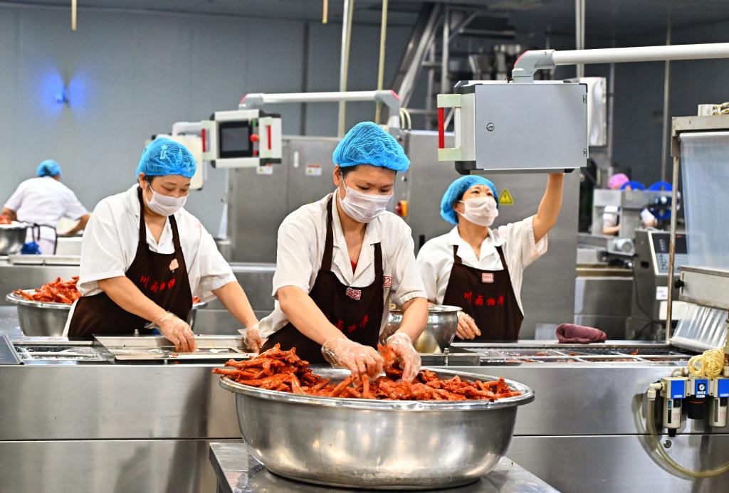 中秋已过,国庆临近。在四川省眉山市仁寿县,四川省川卤相伴食品有限公司迎来“金九银十”订单旺季。生产车间里,35岁的工人廖文娇正在生产线上包装食品。