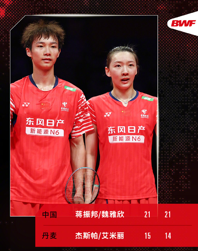 在混双半决赛中,率先出场的中国组合冯彦哲/黄东萍以两个21-14战胜中国香港组合邓俊文/谢影雪,晋级决赛。随后,另一对中国组合蒋振邦/魏雅欣以21-15和21-14同样直落两局,战胜了丹麦组合杰斯帕·托夫特/艾米丽·马厄隆,同样拿到决赛席位。