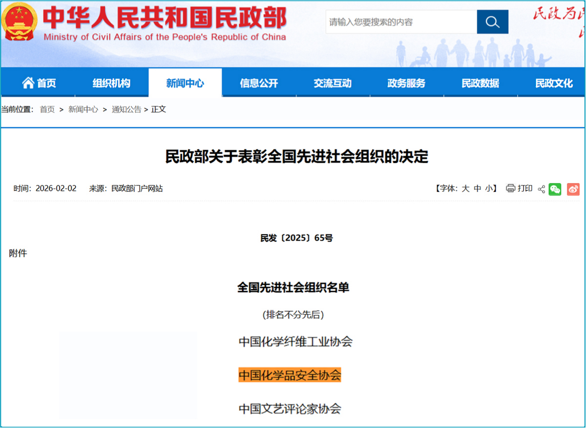 民政部发布关于表彰全国先进社会组织的决定,协会榜上有名。这是自2021年首次获评全国先进社会组织后,协会再次获此殊荣。近年来,协会扎实做好政府服务、企业服务、法规标准建设与行业人才培养等工作,在推动危险化学品领域安全发展中发挥了重要作用。2025年,协会还被中央社会工作部、民政部确定为全国重点培育的45家全国性行业协会商会之一,改革发展实践经验被《中国社会工作报》等媒体报道。