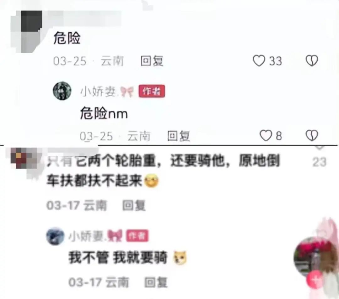 法治网研究院注意到,在“小娇妻”生前发布的相关视频下方,曾有网友评论提醒这种行驶方式很危险,却遭其回怼“我不管,我就要骑”。