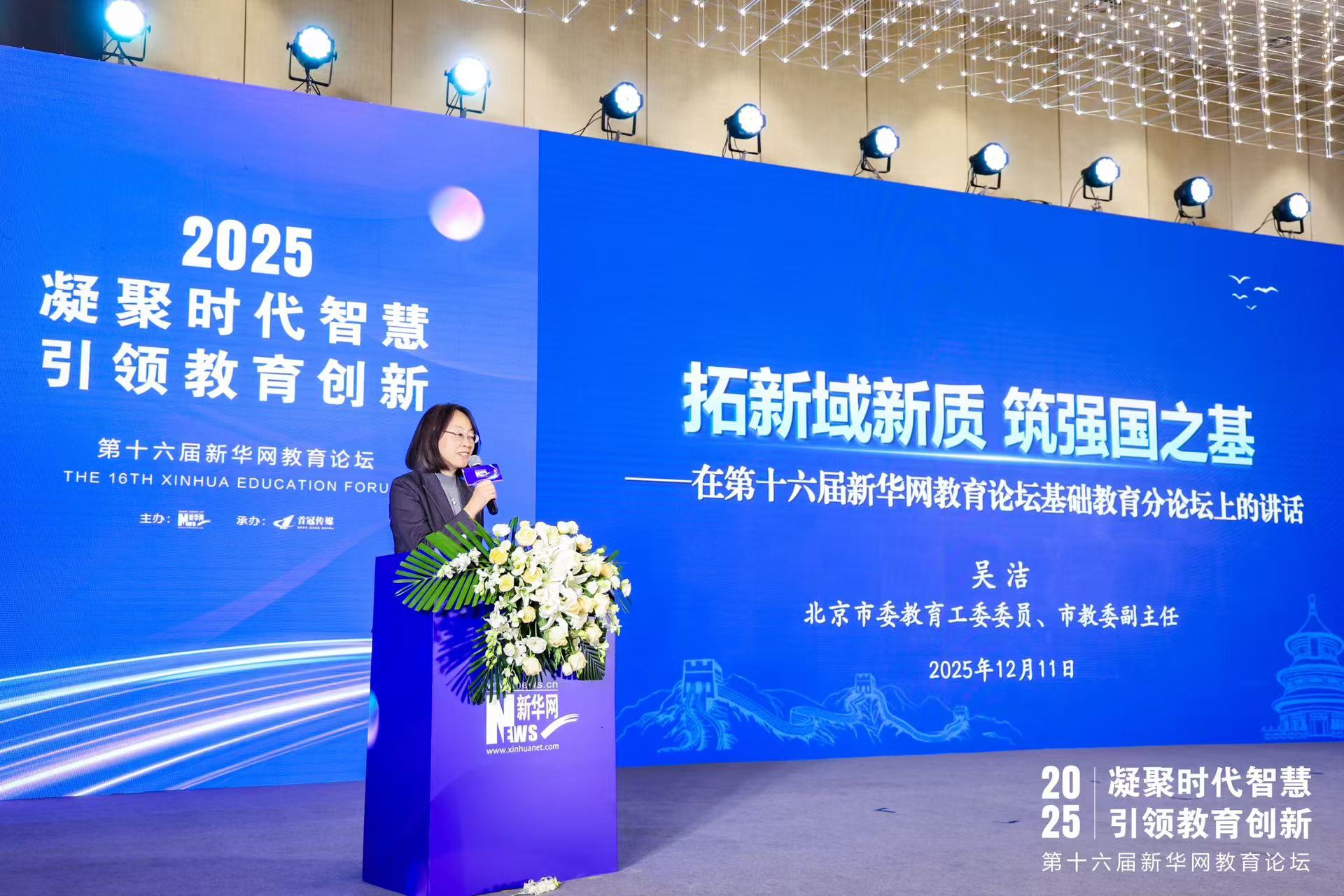 新华网北京12月11日电 11日,以“凝聚时代智慧 引领教育创新”为主题的第十六届新华网教育论坛在京举办。在基础教育分论坛上,中共北京市委教育工作委员会委员、北京市教育委员会副主任吴洁以《拓新域新质 筑强国之基》为题,结合北京的实践探索,就推动首都基础教育系统性跃升进行了系统阐述。