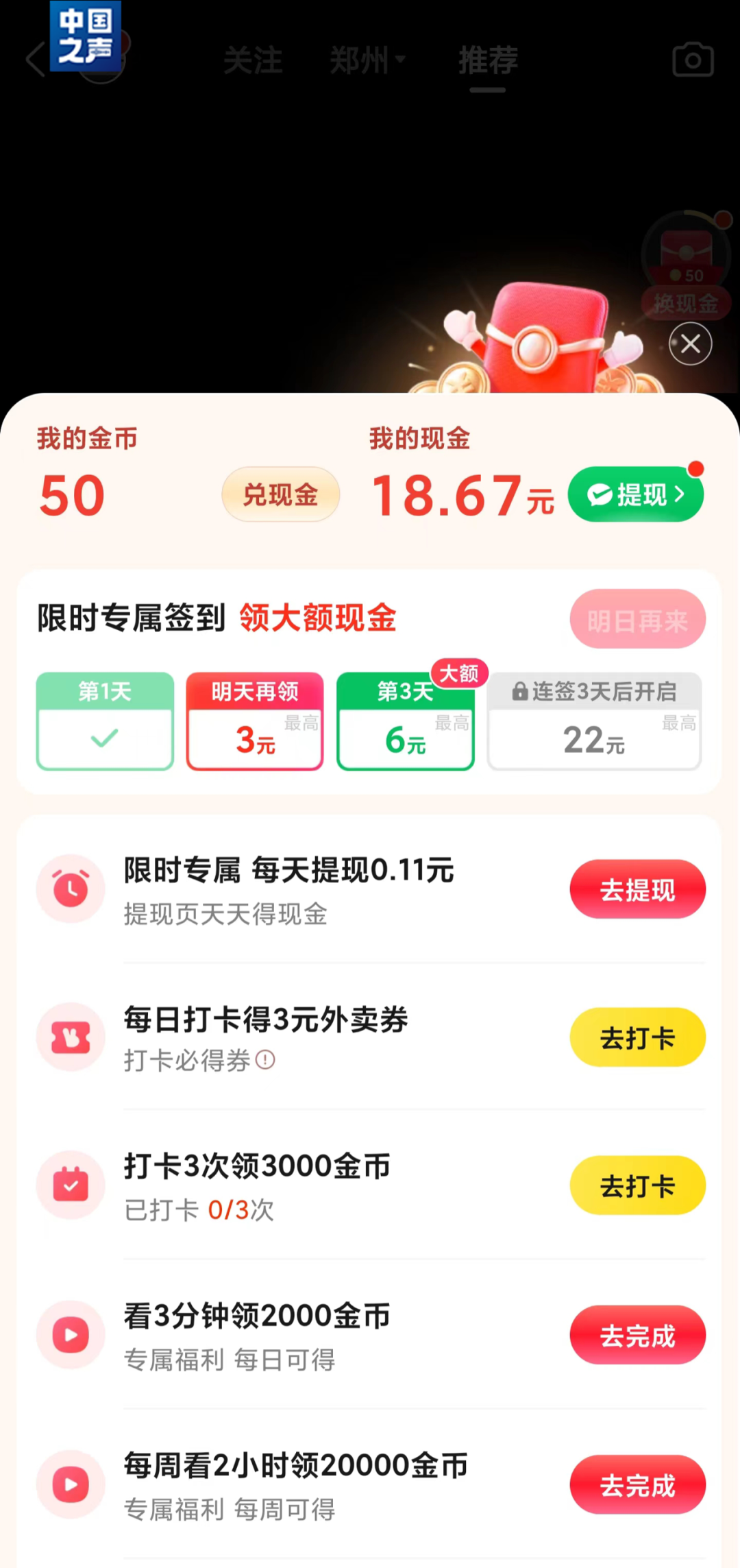 用户齐翔(化名)打开某外卖平台,页面弹出“限时专属签到领取大额现金”的活动,根据提示,连续三天签到就可以领取最高6元的现金,齐翔觉得这个任务看起来很容易完成,就点了第一天的签到。“有一个短视频入口,打开以后有弹窗,弹窗顶上显示‘快速到账提现’,简单几个操作后我的账户里就有了18元多。”