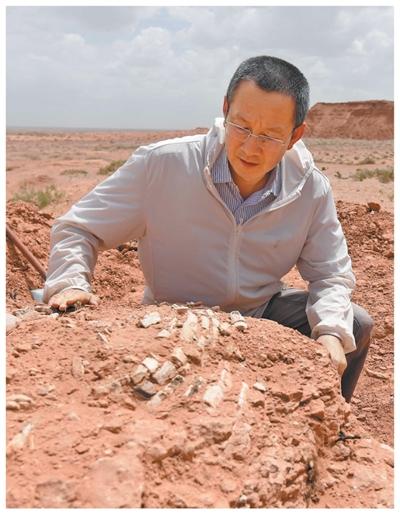 徐星在野外观察恐龙化石。