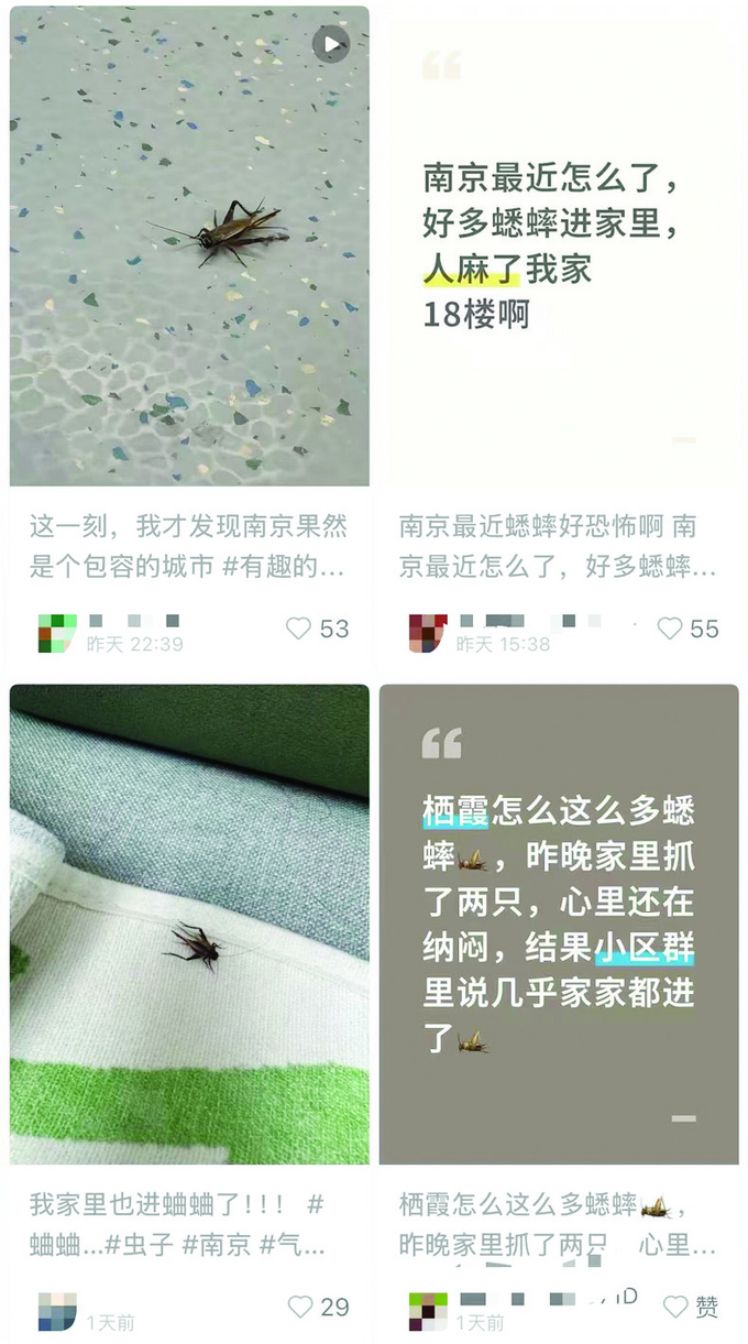“坐标南京,家住18楼,最近家里莫名闯进不少蟋蟀,有人知道是咋回事?”9月25日,扬子晚报/紫牛新闻记者注意到,南京多位市民在社交媒体平台反映,突然有蟋蟀飞进家中,最夸张的数量达到上百只。